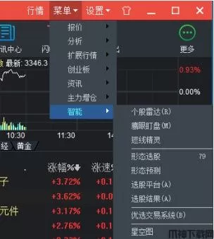 4、其中:【菜单栏】位于终端界面左上方,包括首页、自选、扩展行情、数据、资讯、交易、优品城、业务办理、行情、设置等多个栏目。下拉菜单包含报价、分析、扩展行情、创业板、资讯、主力增仓、智能应用能。终端的基本操作方法、功能都收罗其中,方便您快捷使用。