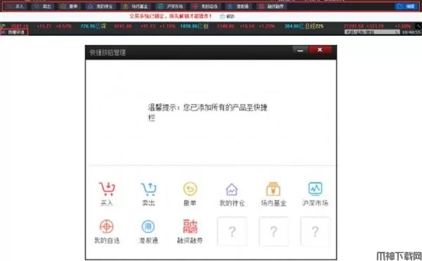 9、【快捷按钮】:快捷按钮位于指数条上方,内容包括买入、卖出、撤单、我的持仓、场内基金、沪深市场、我的自选、港股通、融资融券等。所显示的快捷按钮可进行自定义设置,也可隐藏快捷按钮。