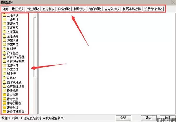 3、这时候会弹出选择品种页,我们可以根据上方的大分类和左侧的小分类进行筛选,找到自己想要添加的自选股。