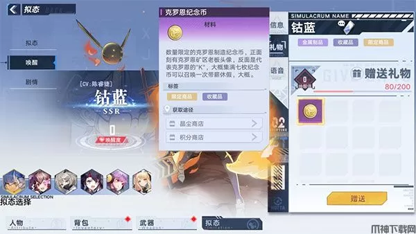 赠送拟态角色礼物时,注意挑选她/他喜好的礼物赠送。例如钴蓝喜欢的是“金属制品”、“收藏品”、“限定商品”,我们送她对应类型的“克罗恩纪念币”能大幅提升唤醒值。反之,赠送的礼物不是拟态角色喜欢的类型,唤醒度只会少量提升。