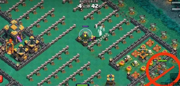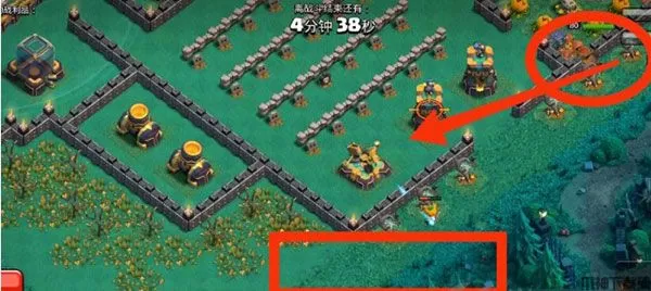 5、女王在拆炸弹塔的时候,就在下面的红色方框内下南瓜头野蛮人,10个左右就够,吸引x弩仇恨。这样可以进一步保证女王和女武神的状态良好。