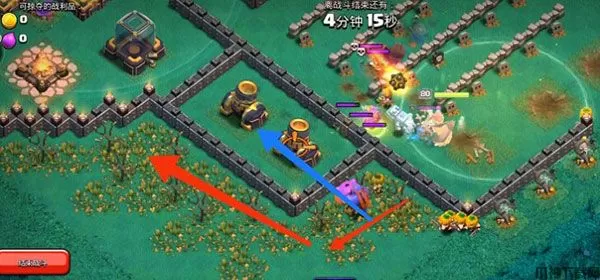 7、女王拆掉x弩后,在如图所示位置放超级蓝胖,超级蓝胖会先按蓝色箭头方向摧毁两个迫击炮,然后往红色箭头方向移动。