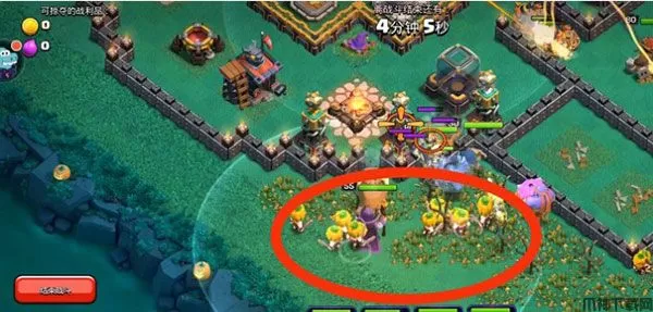 1、右侧红圈内下女武神×2,女武神会自动破墙,破墙后会去打圣水罐。