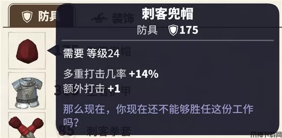 选择游侠24级头盔,属性: 多重打击几率+14% ?额外打击+1。