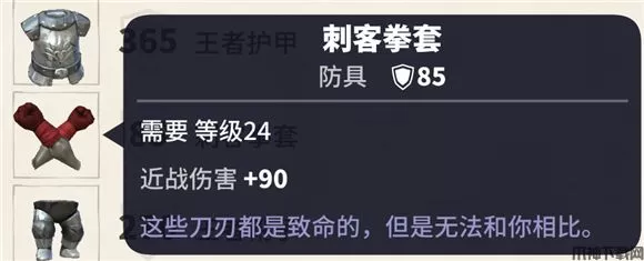 选择游侠24级手套,属性: 近战伤害+90。近战伤害+90 = 什么概念呢??大家注意看自己的属性,当你+1力量的时候你的近战攻击伤害+1,所以此手套+90 等于?+90 力量,可想而知 (不要告诉游侠和法师 他们会羡慕的)?。