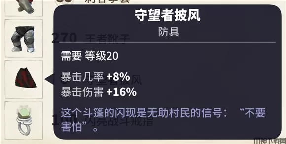 选择游侠20级披风,属性: ?暴击几率+8%, 暴击伤害+16%。