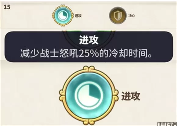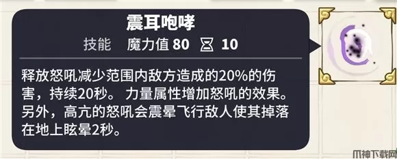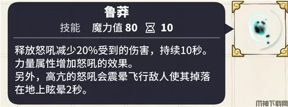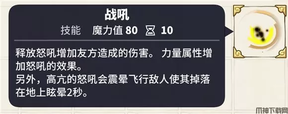 技能效果:战士群体减伤目标20%伤害,冷却10秒,力量属性增加怒吼效果,持续20秒。