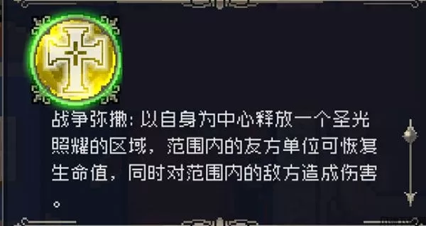 以自身为中心释放一个圣光照耀的区域,范围内的友方单位可以恢复生命值,同时对范围内的敌人造成伤害(单次恢复2生命值,恢复4次,共8点血量;单次造成2伤害,攻击16次,共32点伤害)。