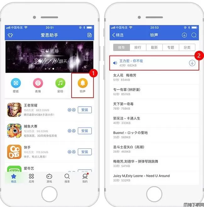 使用“爱思助手移动端”或“爱思助手PC端”下载铃声并且导入到设备中,或通过爱思助手把喜欢的音乐制作成铃声导入到设备中,导入之后就可以在设备上设置成铃声。