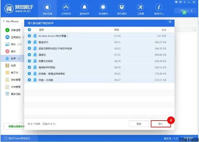 4、在铃声列表中选择需要同步的铃声,点“导入”等待导入完成即可