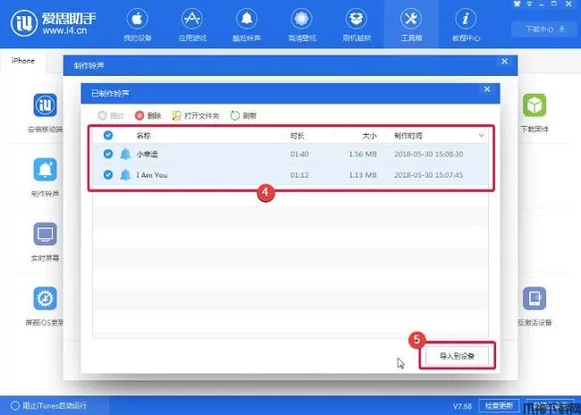 3、选择铃声后点“导入到设备”按钮,等待导入完成