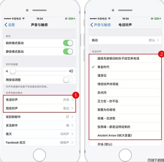 在设备上依次打开“设置 -> 声音(或声音与触感) -> 电话铃声或短信铃声”,在列表中选择铃声即可