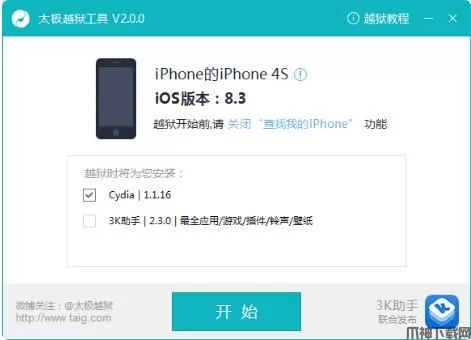 2、安装好之后会弹出“太极越狱工具”,然后点击“开始”越狱