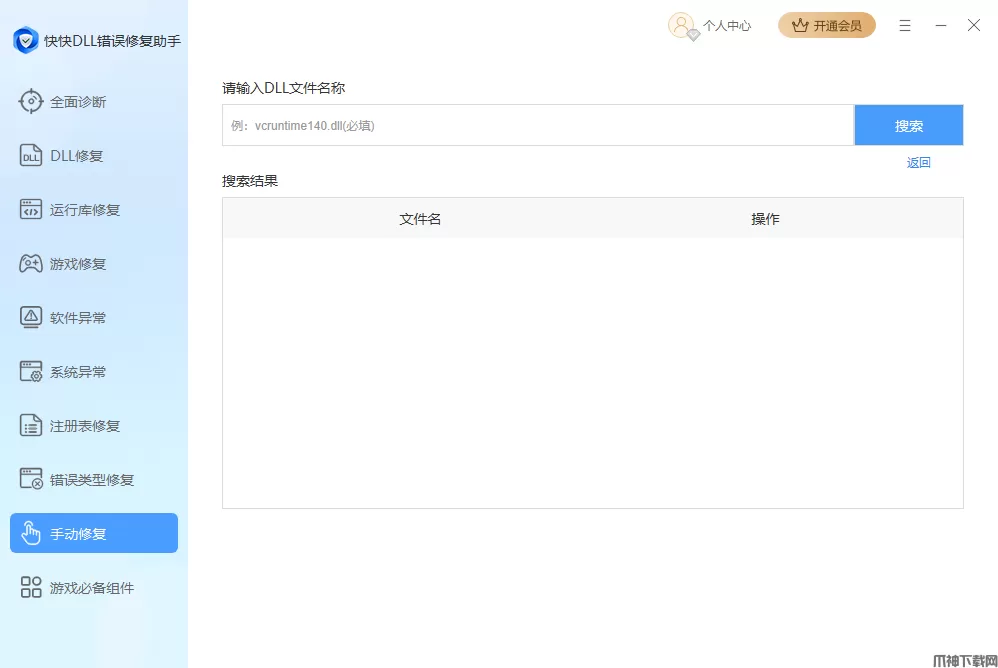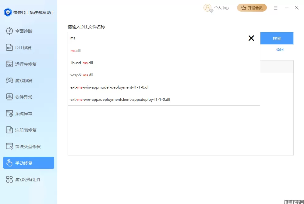 6、手动修复功能适用于部分特殊dll的修复,在输入框内输入需要的dll,在搜索结果里找到对应的项,点击右侧的详情,找到合适的版本,点击立即下载即可,下载后可选择打开文件手动进行操作,或点击立即修复,由软件将其放置合适的位置。