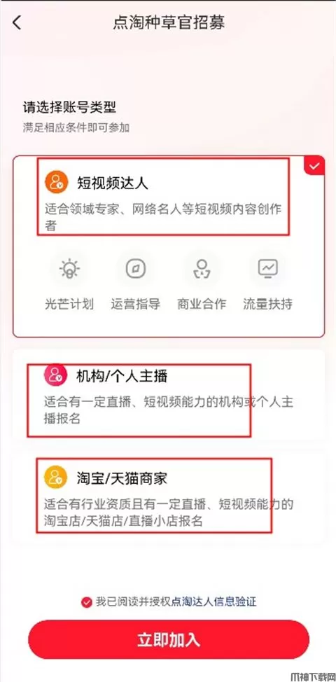 3、进入页面后用户可以选择自己的账号类型,然后点击立即加入。