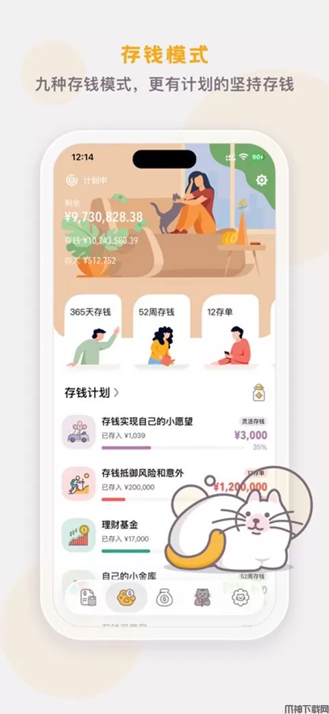 懒猫存钱ios版为用户内置了6种存钱模式帮你更有计划的存钱,同时还精心设计了超有爱的记账模式,从此存钱、记账两不误。同时,懒猫存钱的存钱功能只是辅助大家存钱的一个存钱计划,它会根据选择的存钱模式自动计算好每天/每周/每月要存入的金额,点击存钱相当于存钱打卡,它不会发生真实的存钱交易,所以不涉及怎么取现的问题。