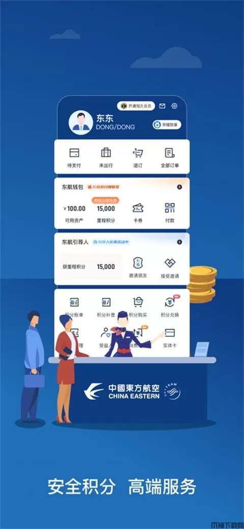 支持东方万里行会员注册登录,实现账单查询、里程查询、受益人查询等功能。