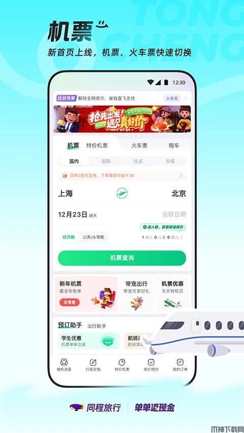 4、机票:特价机票天天有,最低1折起;价格透明,大额优惠券天天领;免费选座,在线值机,随时掌控航班最新状态;线上退改更便捷,退改签不收取额外费用。