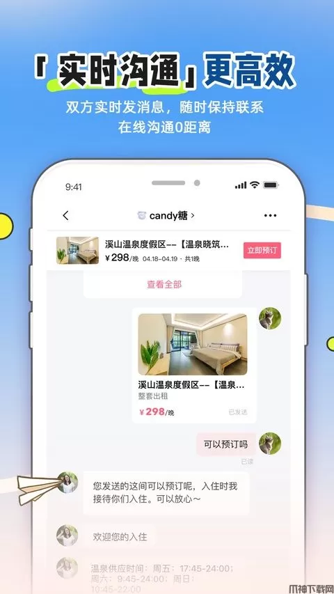 5.你不仅仅可以找到满意的房子,同时,你也可以与房东在线聊天,直接了解房子的具体情况。当然,如果你以为App就只是房东而已,那你就大错特错了!在App上,房东与房客不再只是单纯的利益角色,却而代之的是生活的伙伴,旅游的向导和新结识的朋友。App特别为房东以及住宿过的房客搭建了在线交友平台,如果你是一个新的房客,你不仅仅可以与房东在线交流,同时你还可以跟同样住过这个民宿的其他房客进行沟通,可以分享住宿体验,也可以交流旅游心得等等,在沟通中更加了解彼此,进而成为因小猪短租App而结缘的朋友!