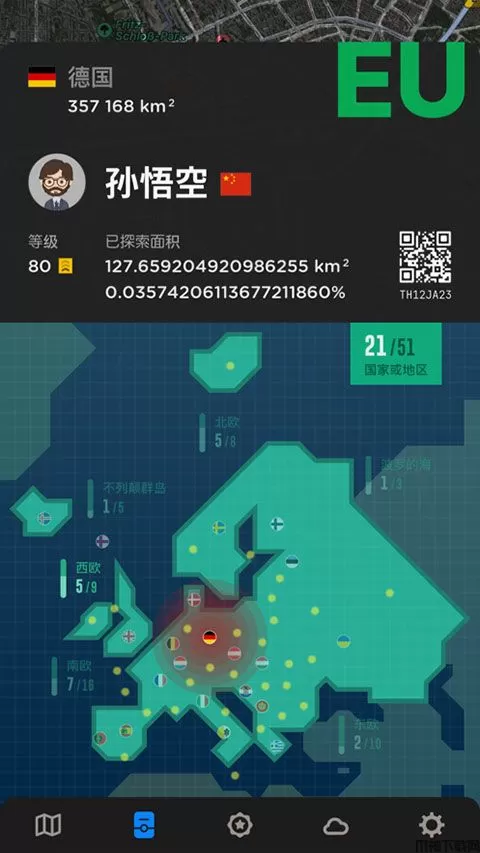 护照页面现在以更大尺寸展现。在这里,我们可以查看在地球上已探索的面积和占比。经过 7 年多的使用,我探索了地表 579.41km² 的面积,只占地表面积的 0.000113595%。
