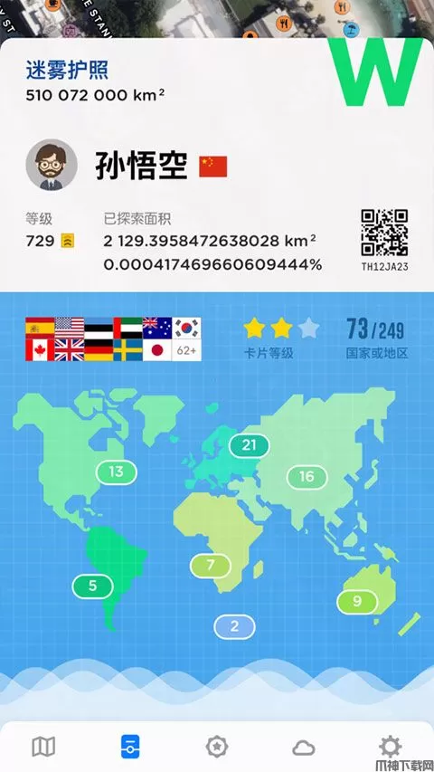 迷雾护照把全球七大洲都展示出来,我们可以看到自己造访七大洲的数量,点击任何一个大洲,还能查看在各洲到达过的国家或地区。点击任何一个国家或地区,还会进一步展现该地区的探索情况。同时,配合所有的切换操作,页面上方的已探索面积和占比数据,也会相应地重新统计和计算。