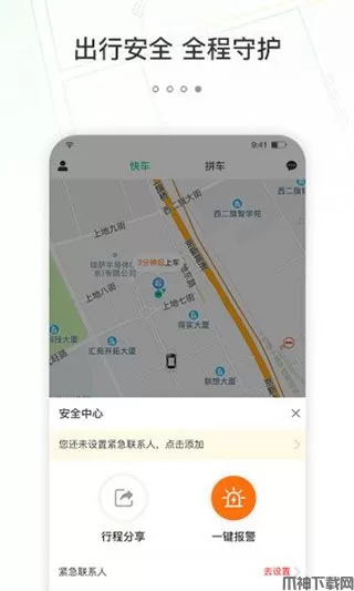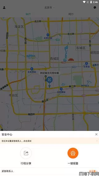 5、点击地图左下角还可以进入【安全中心】,你可以在这里添加紧急联系人、进行行程分享,或者一键报警。