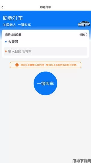6、点击主界面最下方就可以进入到【助老打车】功能,这是专为老年人设计的,用户无需输入目的地即可一键叫车,上车后再口头告诉司机目的地。