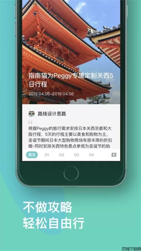 旅行去哪里玩?怎么安排行程?不想自己做攻略?用指南猫iOS版找专业旅行设计师,为你设计专属行程方案。拿着为你设计的电子行程不必跟团,不用做攻略,不走弯路,小众人少,轻松省心,玩得有深度,无论公共交通、自驾租车,还是司导包车,无论背包穷游、休闲度假,还是高端奢华,都能根据你的需求,为你设计出独一无二的旅行路线。不同于传统定制游以产品销售为主要目的,而是以设计出超赞的旅游行程为服务目标,预订与否可以自由选择,价格透明无隐形消费。不同于传统定制游没有旅行经验的旅行顾问,而是由具有实地旅行经验的高学历设计师提供服务,科技加成的智能电子行程,可在旅行中提供一键查看和地图导航支持。