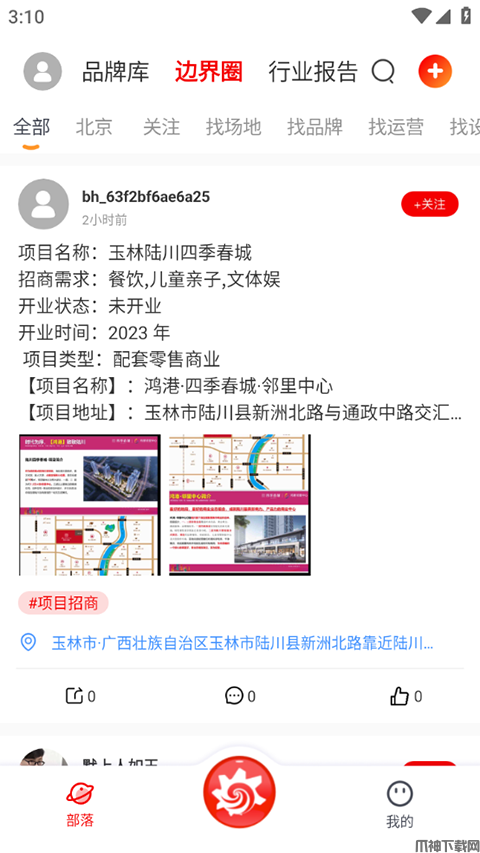 4、边界猎手苹果版提供了部落功能,汇集国内知名行业达人的商业圈内容社区部落,用户可在里面查看加盟商家信息,行业报告,还可以在里面发布内容,以及查看招商信息。