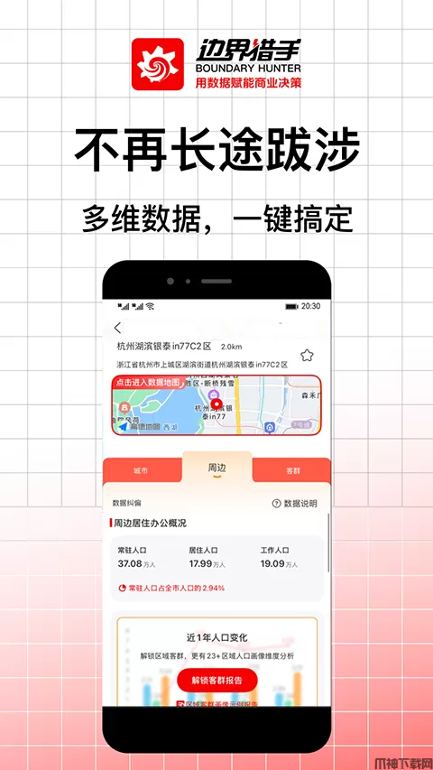 边界猎手苹果版一款功能强大,简单好用的商业调研工具,软件的数据内容覆盖全国366个城市及下辖3009个区县镇市场,商业地产7000+,通过大数据深度挖掘,帮助用户一键获取实时数据,任意城市、点位即刻调研,一键输出调研报告,并且支持最多3个调