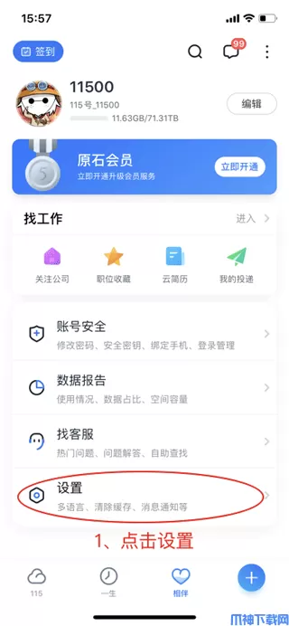 1、首先在115生活iOS版中【相伴】界面点击进入设置。