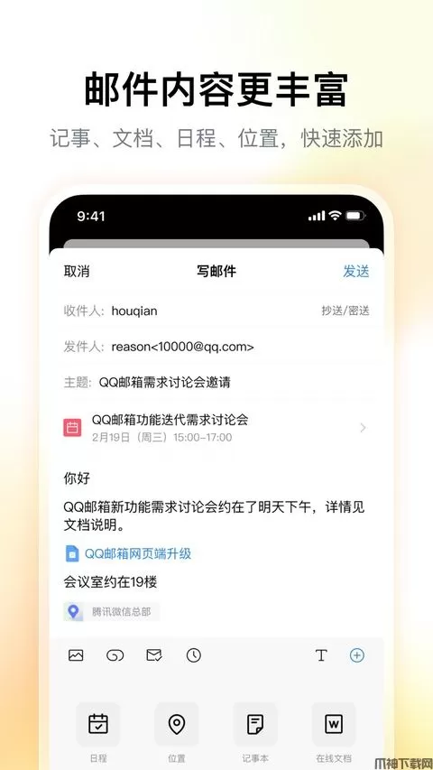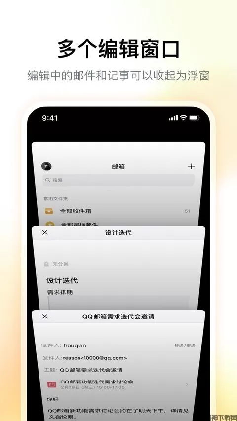 现在的生活节奏非常快而且又紧凑,每个人压力都比较大,有时候上班要带的文件总是忘了拿,放在U盘里也会忘记带,这个时候就真的悲剧了有没有。小编今天就推荐QQ邮箱ios版给大家,QQ邮箱是腾讯公司2002年推出,向用户提供安全、稳定、快速、便捷电子邮件服务的邮箱产品,简洁无广告,容量不限。可将其他邮箱都转发过来,当个不用删除的备用邮件库。可改名,可使用foxmail的后缀地址作为别名。超大附件支持直接拖到旋风下载。支持通过POP等方式管理N多的其他邮箱,我不知道上限,添加个十几个没问题。这是我见过最多的。可以其它邮箱地址发送邮件,有了这个功能,就可以用它来接管你的工作邮箱。手机版QQ邮箱和web版无缝对接,通讯录都自动同步,很方便。更有垃圾过滤功能,让你不再收到乱七八糟的广告垃圾。