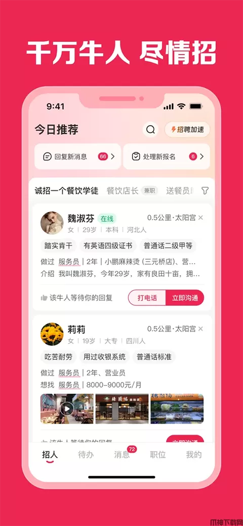 店长直聘ios版是一款免费的服务业领域招聘软件,专注于为广大求职朋友寻找到高薪优质的工作。目前软件已经为海量求职者提供了一个能面对面与店长直接沟通交流的平台,让求职招聘更加便捷。在这里,广大用户可以查询到数十个行业以及上百个热招岗位,无论你是想要从事美容师、客服、发型师、文员、育婴师、护士、汽车销售、导购员还是收银、礼仪、活动策划、理财、模特,来这里,都有你需要的岗位。只要你想得到的行业在这里都能与你进行精准匹配。每天都有数十万人在店长直聘ios版找到工作,需要的赶紧来下载使用吧。