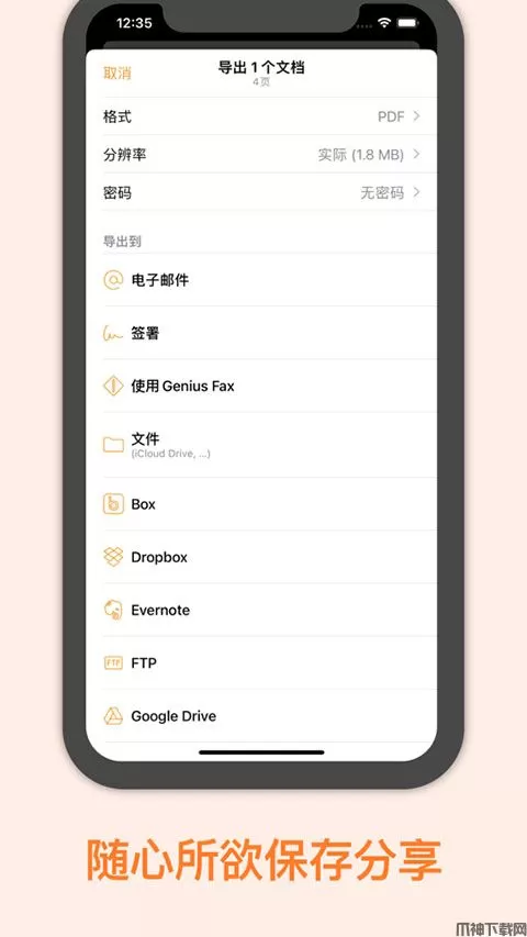 7、可将文档导出到Box、Dropbox、Evernote、Expensify、Facebook、Google Drive、OneDrive、FTP、Twitter、WebDAV及其他应用