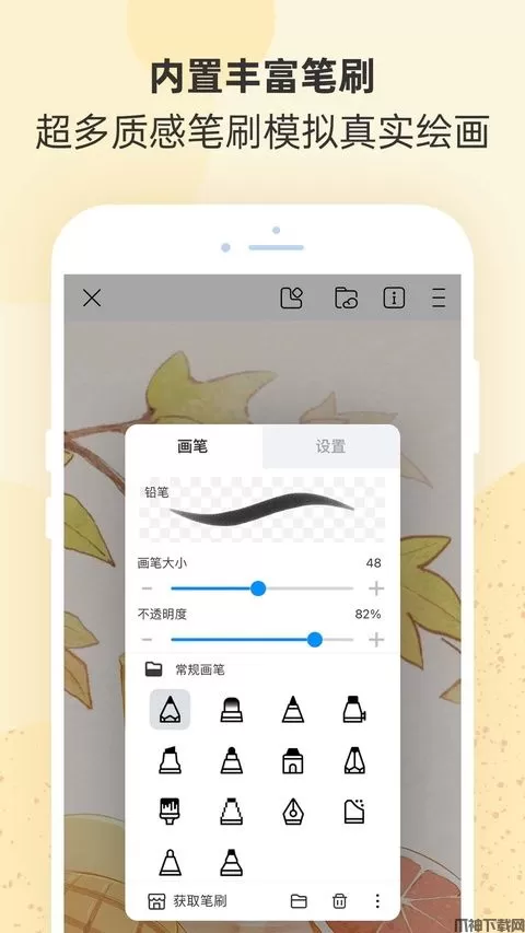 2、我们提供了12种内置画笔供您使用,例如铅笔,用于勾线的圆珠笔和用于着色的水彩笔。每个画笔都有多种设置参数,因此可以根据自己的喜好对其进行自定义。我们还提供了多种笔刷形状与纹理,可以根据自己的需求创造自己的笔刷。将来我们会增加更多的笔刷,所以请多加注意!