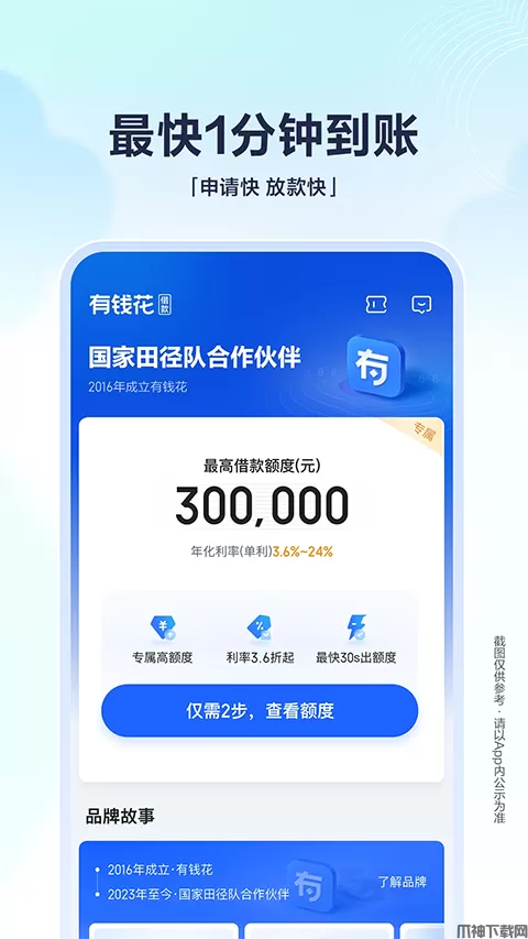 当您用自己手机下载有钱花App后,进入借款入口,查看我的额度 →填写资料 →确认信息 → 获得额度。最快30秒审核,最高20万额度。