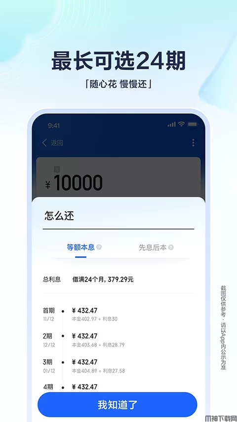 有钱花ios版首推教育金融概念,针对部分主流教育机构提供“先上课,后交费”的教育信贷模式。轻松让梦想分期而至!而且高贷款额度20万元,最长可分12期还款,手续费仅为0.7%哦,比信用卡借贷还划算,每月15日之前还款即可。