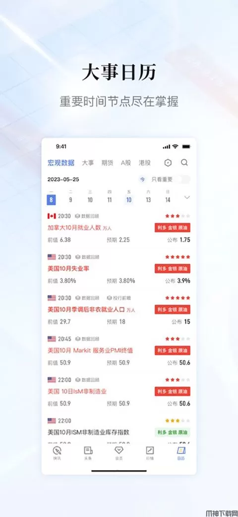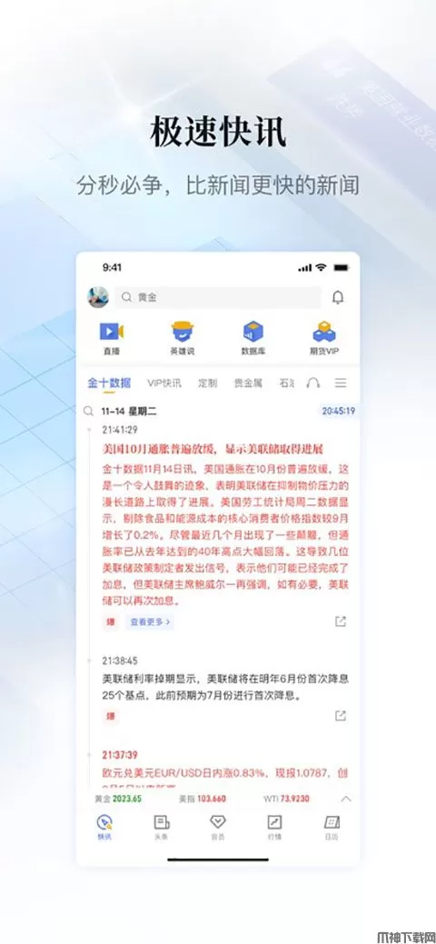 金十数据苹果版是一款国内专业的财经新闻软件和交易工具,其主要功能是提供外汇、期货、A股、原油、贵金属、黄金、美股港股等财经新闻与行情动态,以便于用户更快更准的进行交易。并且,为了满足用户需求,它还提供了自定义订阅报告功能、财经日历提醒功能以及7x24小时的财经快讯,让用户可以更快、更准的分析市场!总的来说,金十数据是一款十分优秀的金融投资应用,有需要的用户可亲自下载体验。