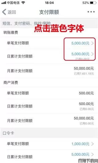 3、在支付限额界面,找到蓝色可修改的数字金额,并点击