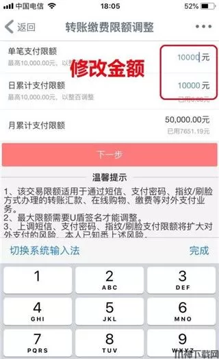 4、在金额修改界面,修改自己想要的限额金额(不超过最大限额),完成后点击下一步