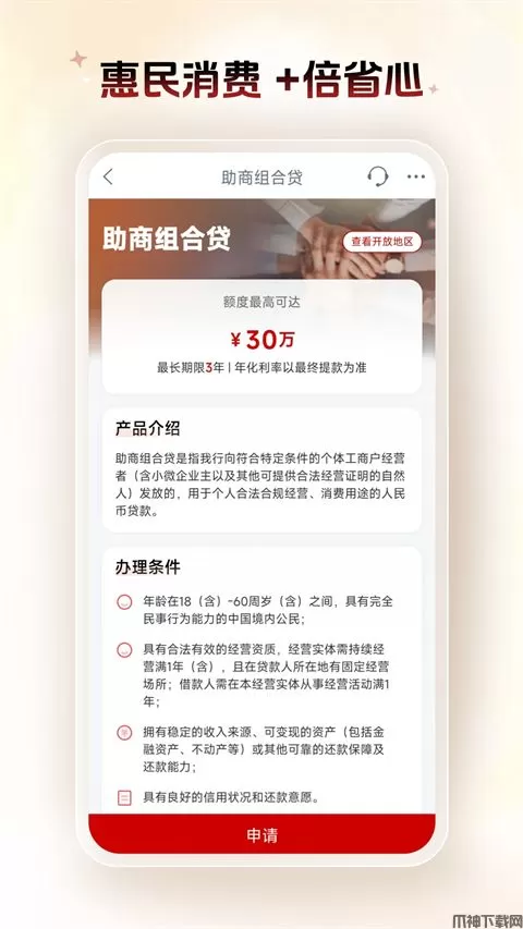 7、贷款申请更快捷:整合融e借、金闪借、经营快贷等多款优质贷款产品,客户多样化的资金选择。