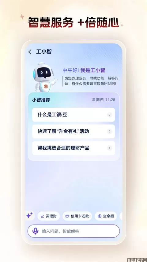 工商手机银行将与您一同步入银行的“即需即用”时代,无论何时何地,您一旦需要我们,即可拿出手机,我们将立即满足您投资理财、资金划转、缴费支付等急迫的需求。拥有工商手机银行,享受工商7×24小时贴身服务。