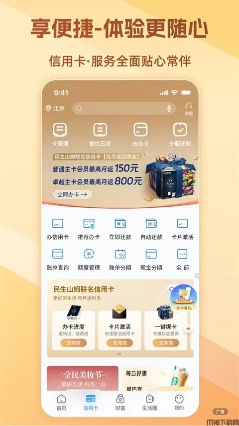 2、享便捷,体验更随心。信用卡频道全新上线,涵盖查账、还款、分期等全方位服务,同步解锁专属权益!
