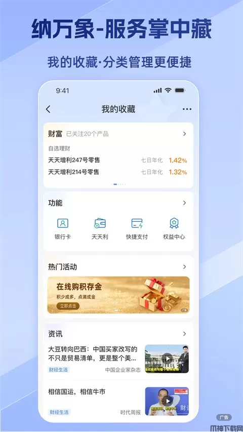 3、纳万象,服务掌中藏。提供收藏功能,支持财富产品、活动等分类收藏管理,打造专属服务清单!