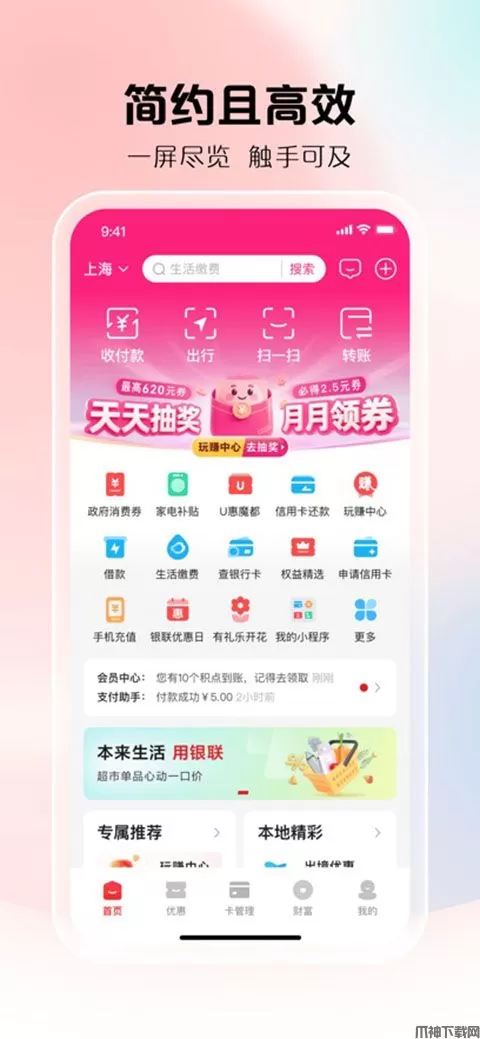 云闪付ios版是由中国银联携手各商业银行、支付机构等产业各方共同开发建设以及维护运营的移动支付平台,该软件具有收付款、享优惠、卡管理三大核心功能,用户只需在应用内绑定银行卡就可以随时随地享受刷脸、NFC、银联IC卡、穿戴设备等多种支付方式,让你在商场购物shopping时更加快捷。同时,这款软件内汇聚了各机构的移动支付功能、特色服务与权益优惠,而且该软件有中国银联作为安全技术保障,无需担心自己的财产安全问题。能够让用户告别现金时代,为广大的消费者用户安全、便捷的一站式移动支付服务。不仅如此,该软件还会不定期与个大互联网公司合作推出各种优惠活动,更是有着手机充值、信用卡还款、公交充值等生活服务功能,让你的日常生活越来越舒心。