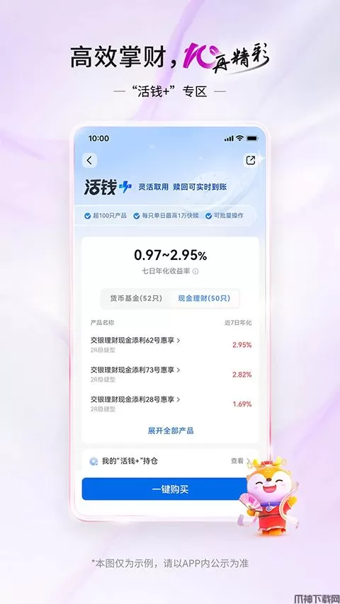 2、"活钱+"专区:超100只快赎产品可供选择,灵活取用、快速到账。