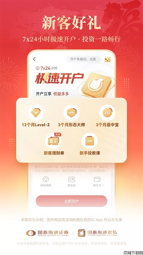 新客户通过国泰海通君弘APP开立证券账户,可获得level2行情月卡、智能优选三个月、新手投资训练营、新客理财券一张、生日理财券一张。开户成功后,卡券将自动发放到对应的君弘APP上,限有效期内使用一次。