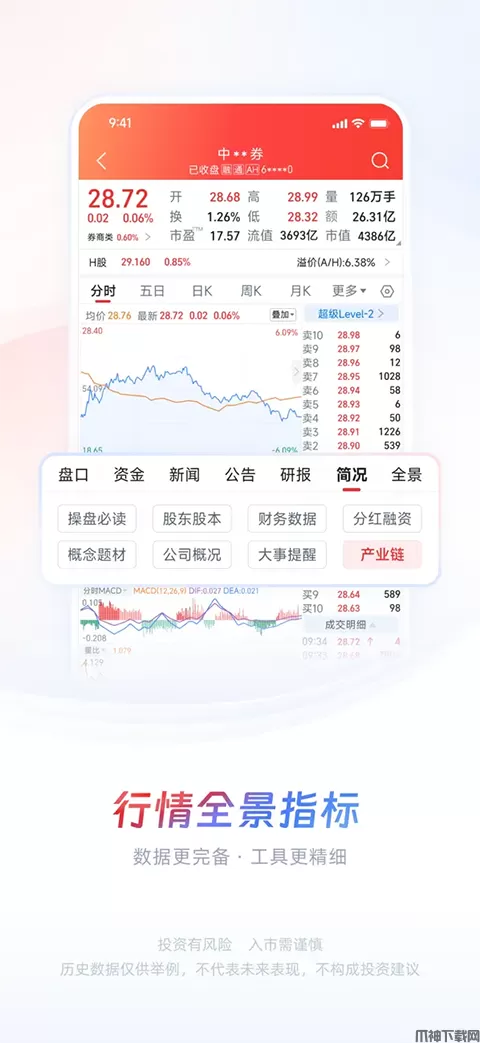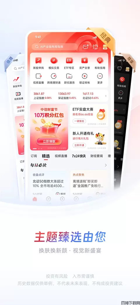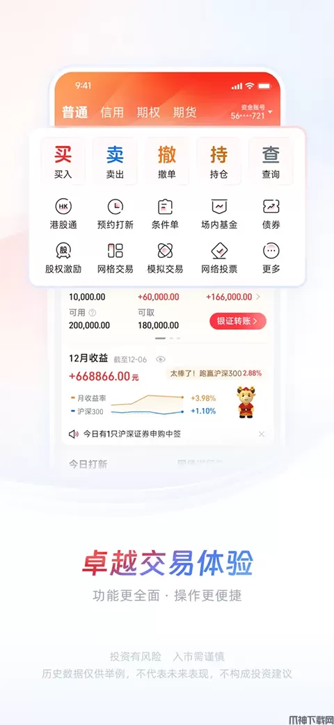 中信证券信e投ios版是一款炒股投资神器,专为理财用户提供便捷的股市行情和在线交易等服务,你可以直接在线进行证券投资交易操作,全方位支持各种证券业务办理,页面设计时尚流畅,更多自主人性化功能等你来实用。软件集行情、委托、资讯等一系列的综合服务平台,行情走势一目了然,费用低廉,技术支持和通道支持强劲有力,服务全面贴心,足不出户就能快速了解股市资讯,各种证券交易在线就能直接操作。在这里交易功能仅需一键注册,点击在线交易,在一键注册界面,点击一键注册,等待30秒后自动激动进入交易功能,速度方便又快捷,避免各种烦人的注册程序。用户在这里可获取最新最全的证券行情信息,紧跟市场热点,随时掌控大盘波动,并通过要闻、直播、新股、公司等资讯高效分析并理解当下财经事件,支持多种委托方式的快速买卖。
