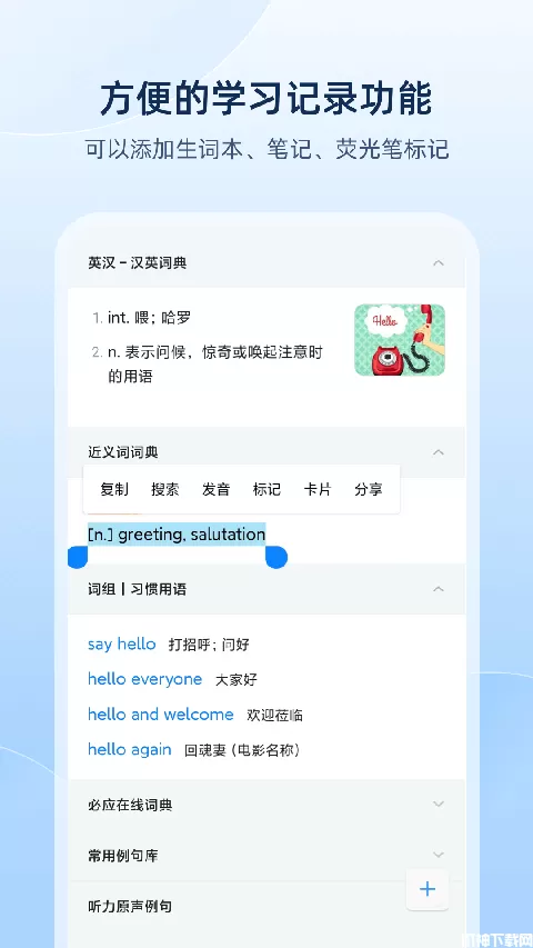 6、联机词典 基于海量数据的云端词典,生僻词、例句、图片查询一网打尽