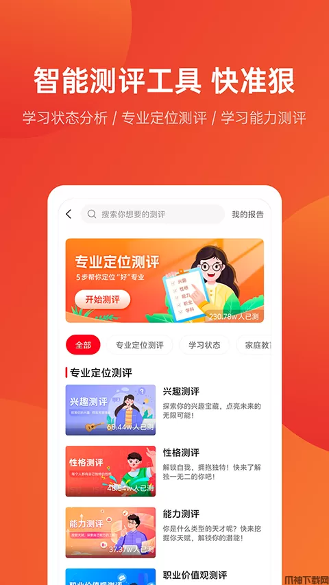 从"兴趣"、"性格"、"能力"、"学科强弱"、"职业倾向"5大维度认知自己,根据测评推荐适合的专业。